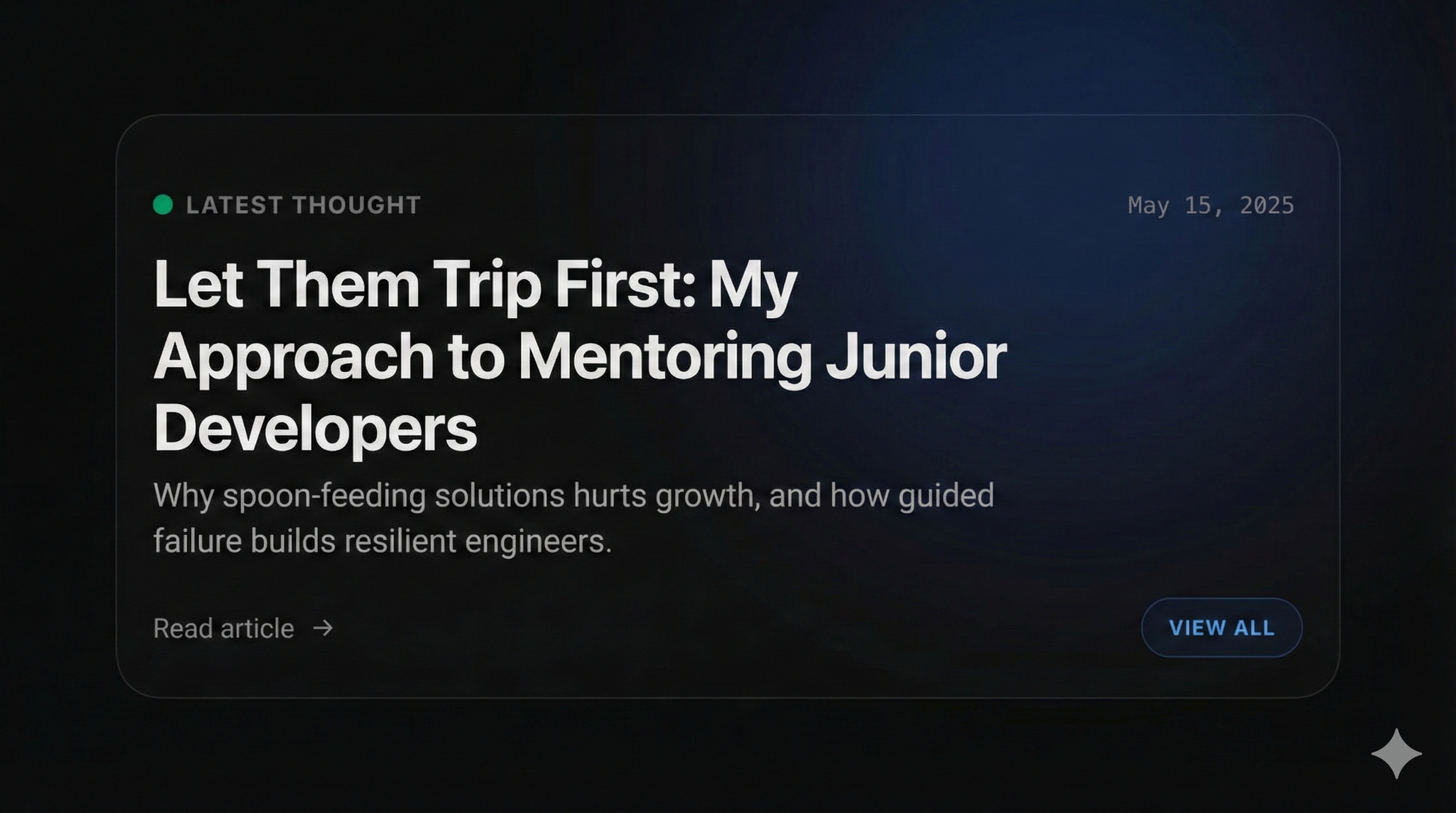 Give your juniors the space to trip and the tools to analyze the fall. You will end up with resilient engineers, a healthier codebase, and perhaps most importantly you won't burn yourself out trying to be the hero.